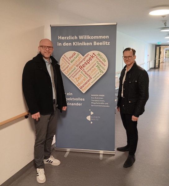 Pflegedirektor Nico Kleine-Knefelkamp (links) und Geschäftsführer Enrico Ukrow (Kliniken Beelitz, Brandenburg) stehen hinter der Kampagne und stellen sich damit vor ihre Mitarbeitenden in allen Berufszweigen.